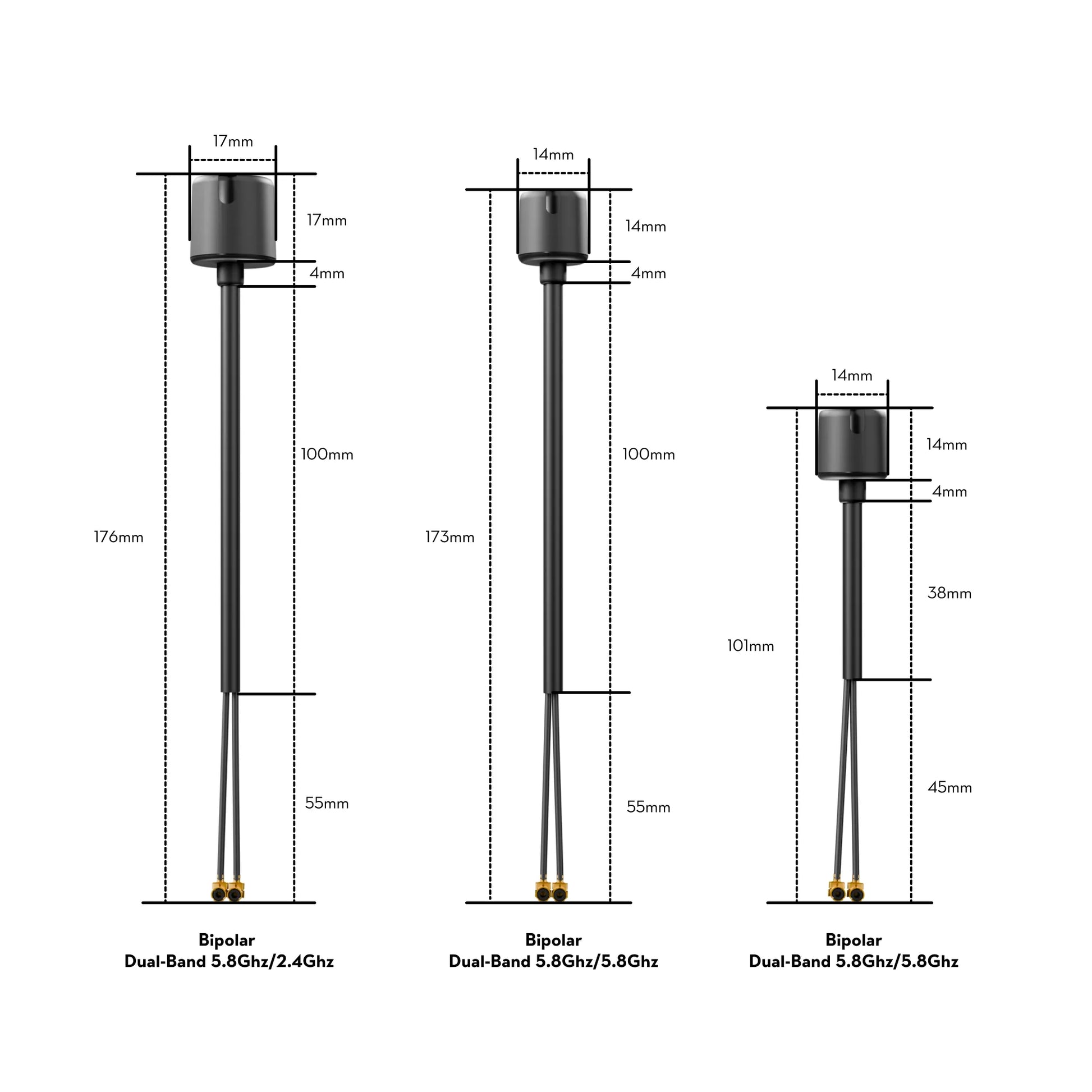 Flywoo Bipolar, its latest Dual-Band series antenna, is meticulously engineered for the O3 / O4 PRO air unit. This series, featuring two types of antennas - Dual 5.8GHz/2.4GHz and Dual 5.8GHz, is designed to enhance transmission distance while boasting exceptional interference resistance capabilities.