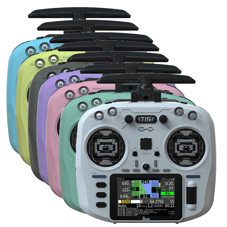 Jumper T15 is the flagship of Jumper. The radio is very similar in design to the Jumper T14, but has a large colour display and six buttons and 7 available colors. The Jumper T15 uses EdgeTX firmware and has a 1W ELRS module on 2.4GHz. The radio is 185x175x79mm in size, which is comparable to radios like the TBS Mambo or Radiomaster Boxer. Even at this size, it uses large hall metal CNC gimbals. The Jumper T15 will provide four switches, two potentiometers and two buttons that can be swapped out for switches. There are six adjustable buttons. There are also joysticks on the radio for trim adjustment. A great advantage is the integrated memory, which replaces a conventional SD card, greatly increasing the reliability of the radio. For easier transport, it has a folding swivel antenna. The radio has a unique color touch IPS display with a resolution of 480x320 pixels and a size of 3.5".